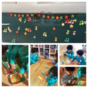預かり保育では、子どもたちがキラキラのクリスマスの飾りを作りました🌟 音符や星に金色と銀色の折り紙を上手に飾り付け、お部屋がとても可愛らしく賑やかになりました😊💖 今日の夜は、みんなのところにサンタさんやってくるかな〜🎅💭 投稿ナビゲーション 12月のお誕生日会&クリスマス会 新年