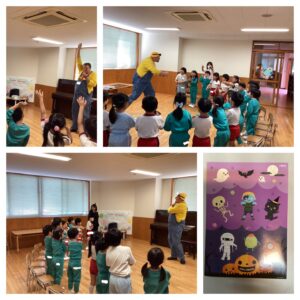 今日のECCは、ネイティブのジョージ先生が来てくださり、ハロウィンの授業をしてくださいました🎃 ミニオンの衣装のジョージ先生に大喜びの子どもたち😊 魔女、コウモリ、カボチャのおばけ、ガイコツなどを英語でなんというか覚えたあと、ハロウィン椅子取りゲームをして大盛り上がりでした😆 お土産にハロウィンシールをもらって嬉しそうでした! おうちでも英語でハロウィン単語がなんというか聞いてみてくださいね♪ 投稿ナビゲーション お楽しみ会 体育指導(笹)